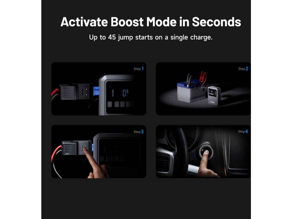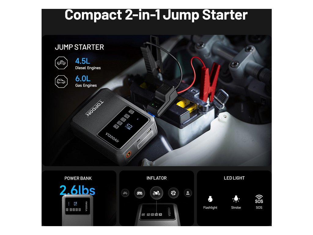 TOPDON V1200 Air je multifunkční zařízení, které vám ušetří místo v kufru i starosti na cestách. Díky startovacímu proudu 1200 A spolehlivě nastartuje 12V vozidla – osobní auta, motorky, SUV i menší dodávky. Už se nemusíte obávat vybitých baterií, protože pomoc je vždy po ruce. S podporou motorů až do 6,0 l benzínu nebo 4,5 l nafty vám V1200Air umožní jednoduše vyrazit během několika minut.