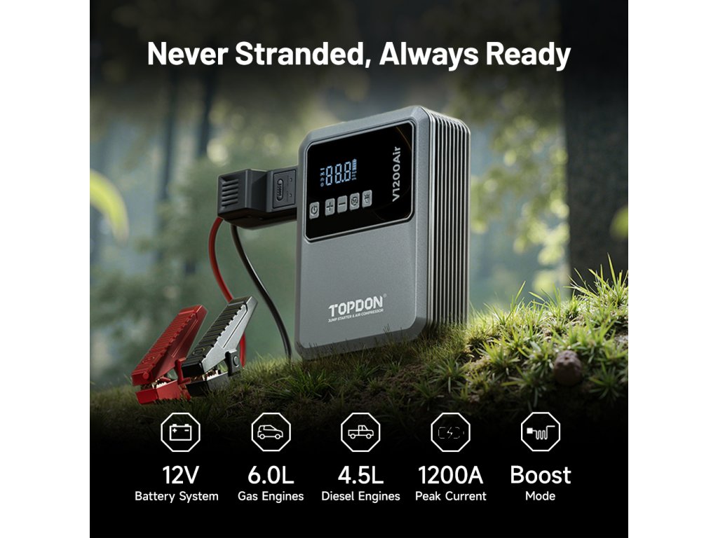 TOPDON V1200 Air je ideálním řešením pro každého, kdo chce být připraven na nečekané situace – ať už na silnici, v kempu nebo při každodenním používání.