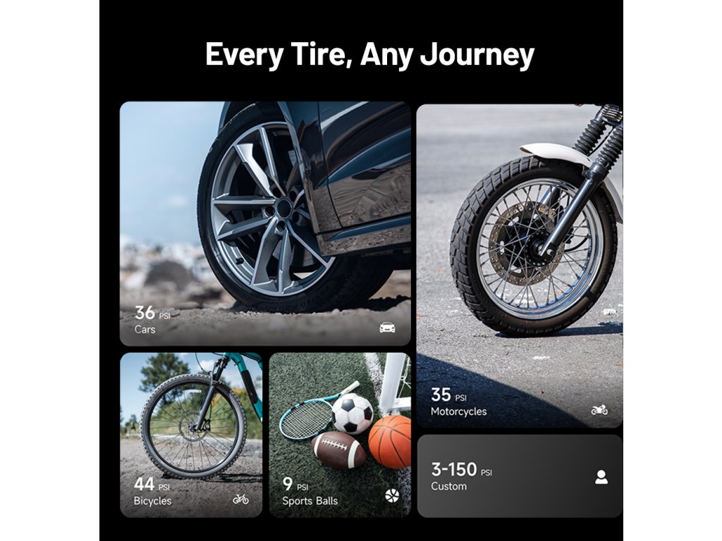 Maximální tlak 150 PSI nafoukne pneumatiky auta, motorky i jízdního kola a nechybí ani adaptéry pro sportovní vybavení či nafukovací doplňky. Na přehledném LCD displeji snadno nastavíte požadovaný tlak a kompresor se sám zastaví po dosažení zadané hodnoty.