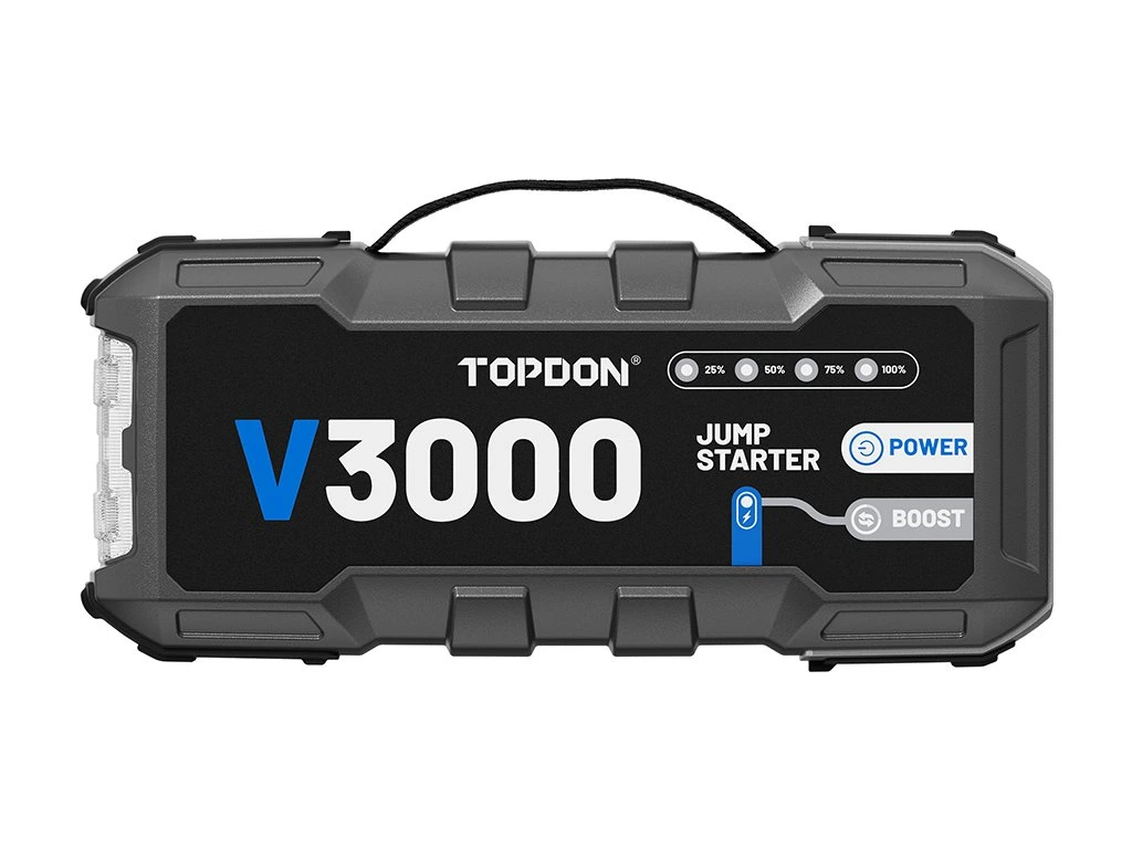 Startovací zdroj TOPDON V3000 je výkonově silný startovací booster a powerbanka v jednom je navržen pro náročné podmínky a vozidla s 12 V systémem (osobní auta, SUV, pick-upy, menší nákladní vozidla). Disponuje špičkovým proudem až 3000 A, díky čemuž spolehlivě nastartuje benzínové motory až 9,0 l a naftové až 7,0 l.