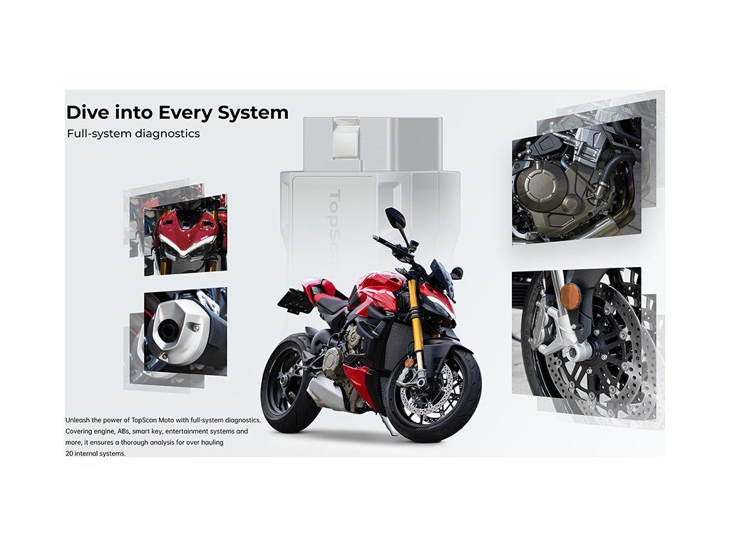Uvolněte sílu systému TopScan Moto s diagnostikou celého systému. Zahrnuje motor, ABS, inteligentní klíč, zábavní systémy a další a zajišťuje důkladnou analýzu pro generální opravu 20 vnitřních systémů. Komplexní přístup zajišťuje přesné řešení problémů.