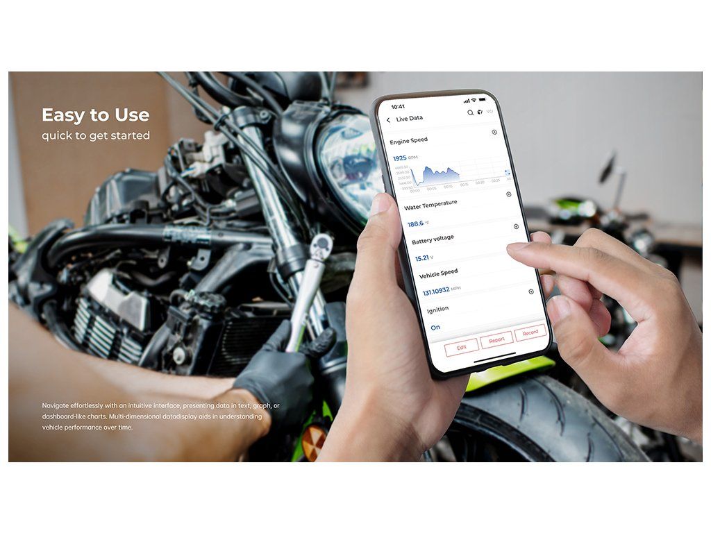 Kompaktní rozměry přístroje TopScan Moto jsou navrženy pro použití na cestách. Kompatibilita s Bluetooth 5.0 nabízí bezproblémovou bezdrátovou diagnostiku, takže se nemusíte obávat zamotaných kabelů nebo omezené mobility. Můžete ji nosit sebou a řešit problémy kdekoli a kdykoli.