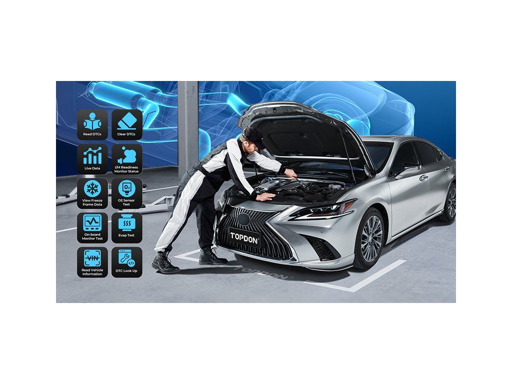 Přístroj TopScan Pro od společnosti TOPDON funguje jako čtečka kódů OBD2 a provádí všech 10 režimů testování OBD2 zdarma po celou dobu životnosti, což vám umožní přístup k důležitým informacím o ještě více vozidlech. Podporuje také všechny funkce, včetně čtení DTC, vymazání DTC, živých dat, stavu monitoru připravenosti I/M, zobrazení dat Freeze Frame, testování snímače O2, testování palubního monitoru, testování výparů, čtení informací o vozidle a vyhledávání DTC.