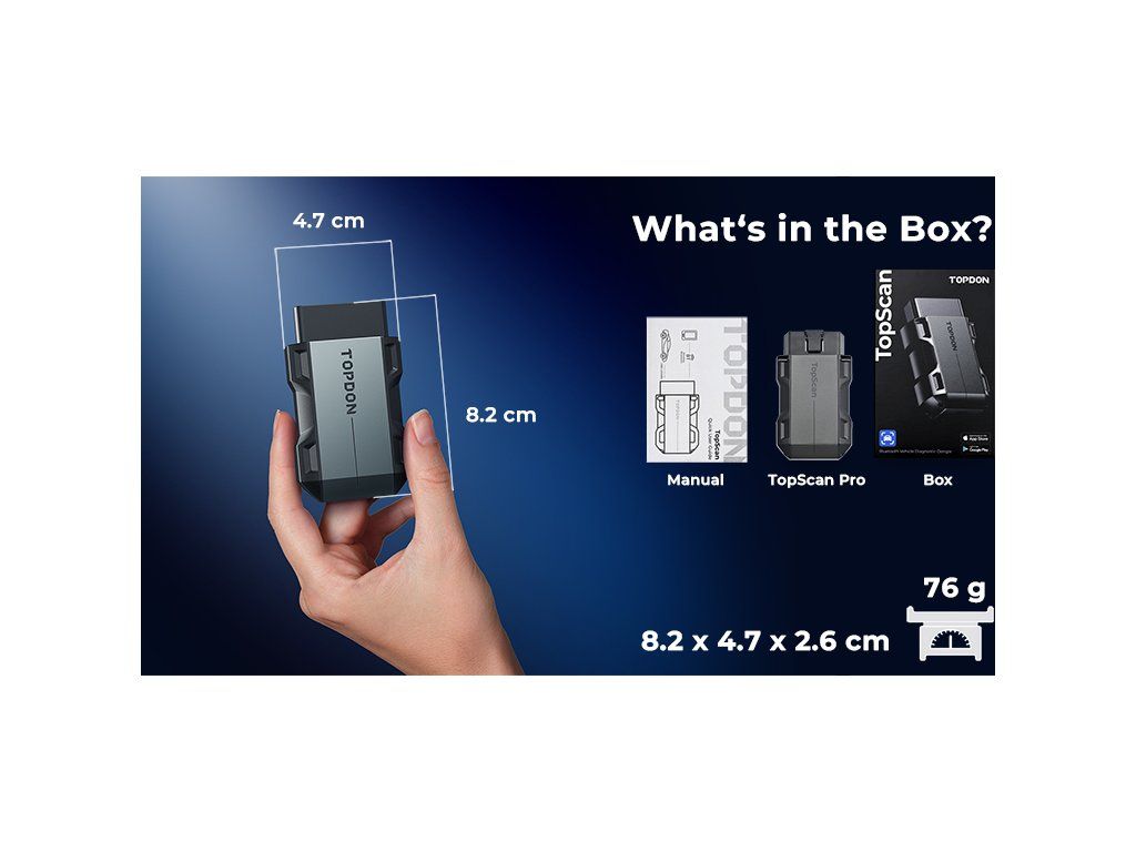 TopScan Pro - je kapesní diagnostické zařízení, které promění váš telefon ve skenovací nástroj a drží krok se svými uživateli, kteří překračují rámec základního skenování. Připojte TopScan Pro k portu OBD2 a začněte diagnostikovat prostřednictvím aplikace pro Android i iOs