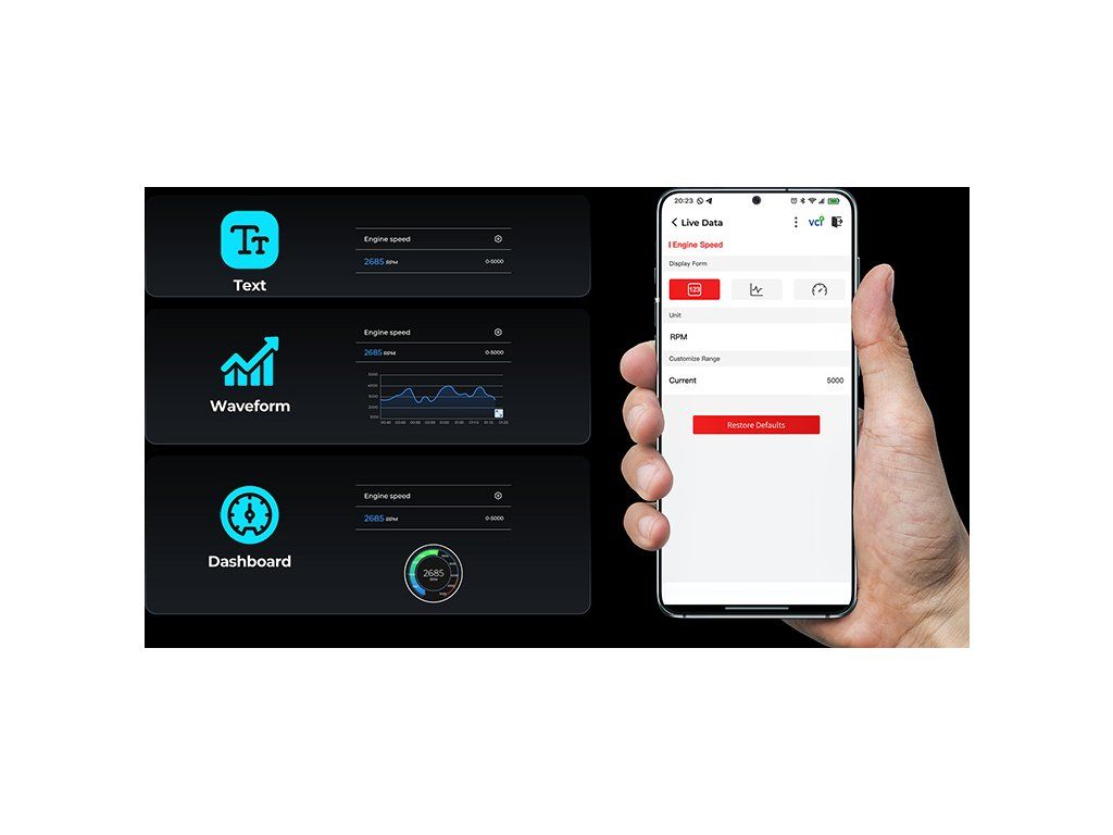 Zobrazení datových toků ve formě textu, grafu nebo grafu podobného přístrojovému panelu. To pomáhá uživatelům intuitivně sledovat změny dat v čase. Použití funkce "Kombinovat" pro grafické zobrazení až 4 datových toků v jednom rozhraní umožňuje uživatelům vyhodnocovat výkonnost pomocí srovnávacích dat a dělat přesná a efektivní rozhodnutí.