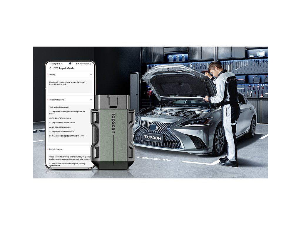 Přístup k 8 službám údržby, technologii AutoVIN, testování výkonu vozidla a dokonce i k obousměrnému ovládání prostřednictvím telefonu. Mezi další výhody systému TopScan Pro patří průvodce opravami DTC v celém systému a připravenost k I/M jedním kliknutím.