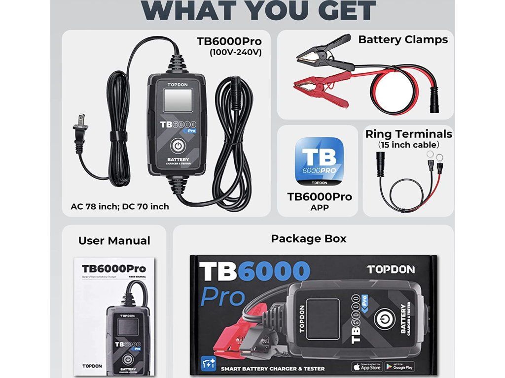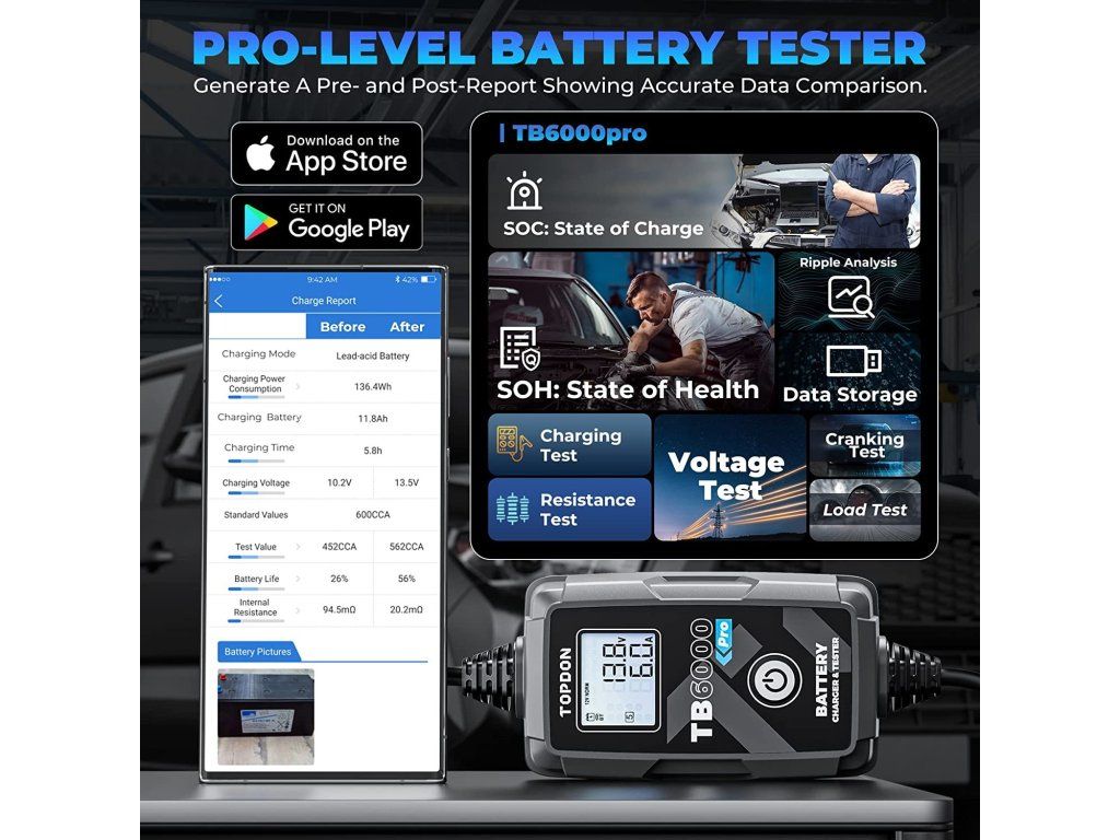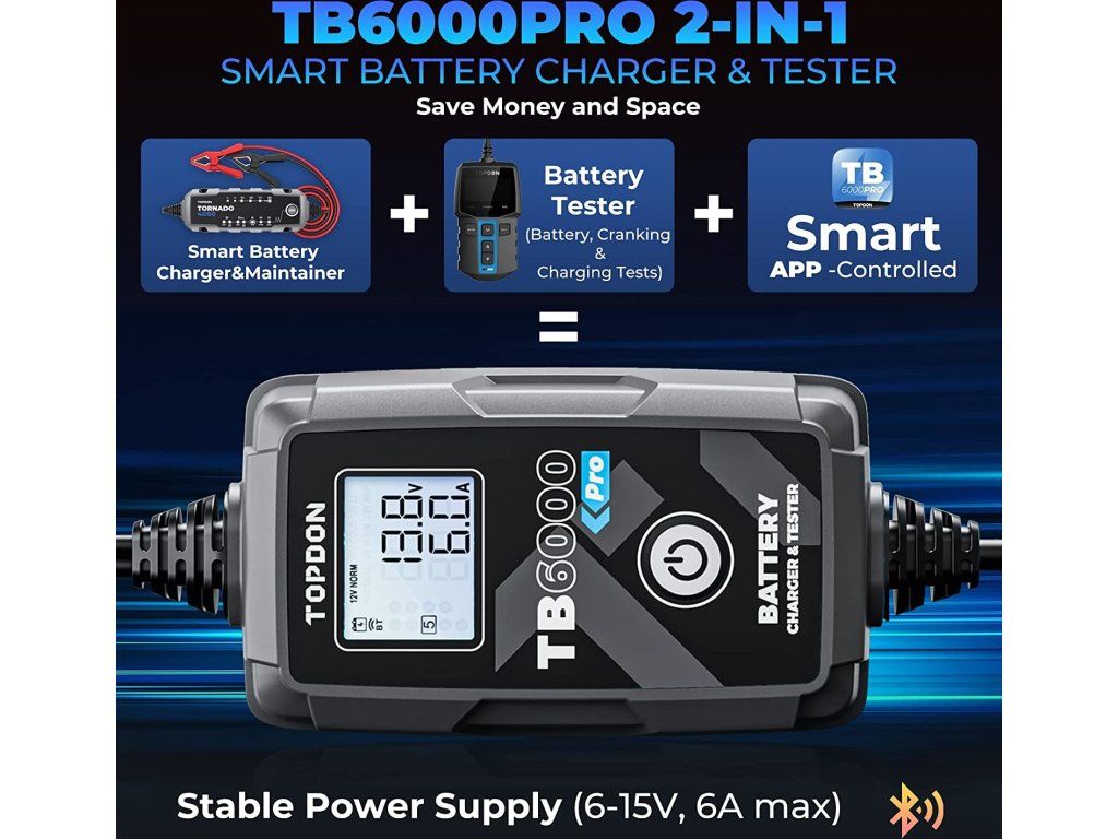 TB6000Pro podporuje podrobné testy nabíjení a 'cranking' testy pro 12V a 24V a poskytuje vynikající diagnostiku baterií prostřednictvím mobilní aplikace.