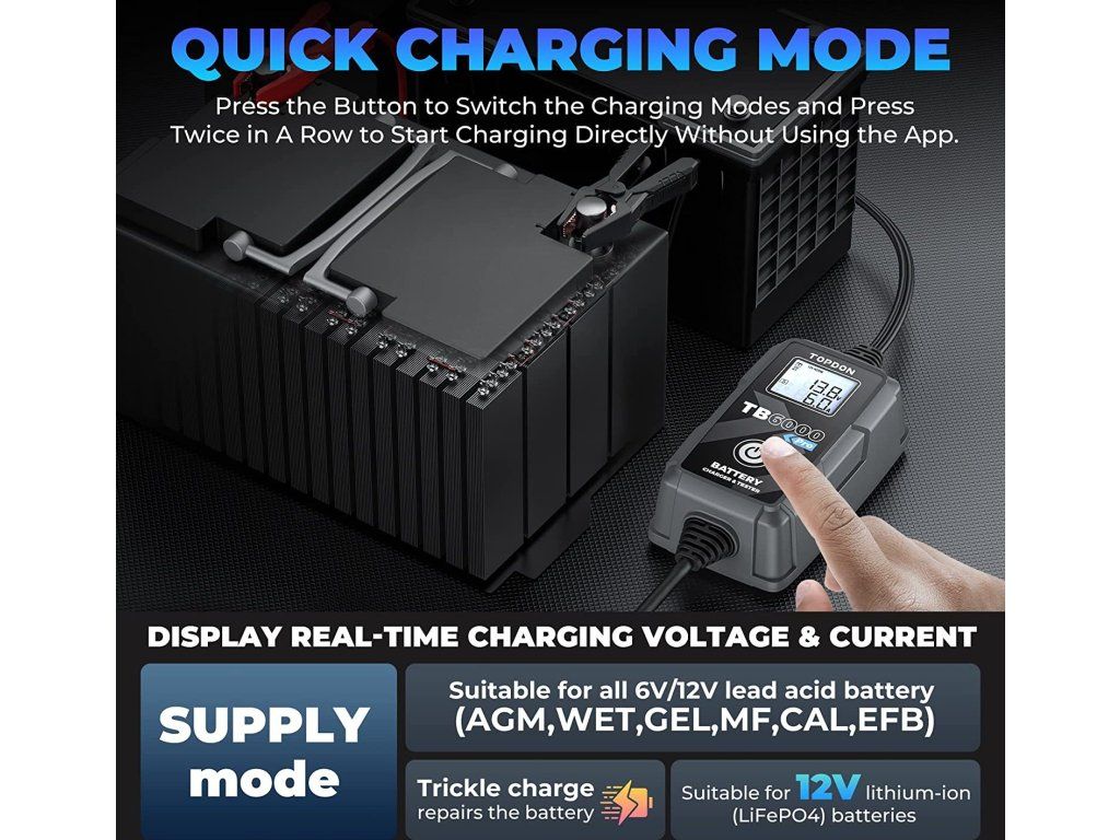 Jste už unavení individuálním nastavováním nabíjení? Nechte TB6000Pro udělat práci za Vás. Patentované 9stupňové inteligentní nabíjení společnosti TOPDON poskytuje Vaší baterii optimalizovaný, udržovaný a integrovaný proces nabíjení.
