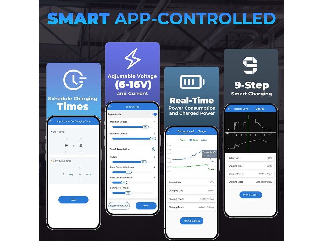 Kompatibilní se všemi typy 6V a 12V olovo-kyselinových baterií a 12V lithiových baterií (LiFePO4). Podporuje i více typů baterií: LI, zaplavené, gelové, MF, CAL, EFB, AGM.