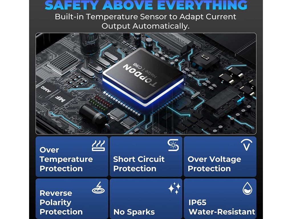 Díky inteligentním bezpečnostním funkcím TB6000Pro jsou uživatelé chráněni proti přepólování, jiskření, zkratu, přehřátí a přepětí.