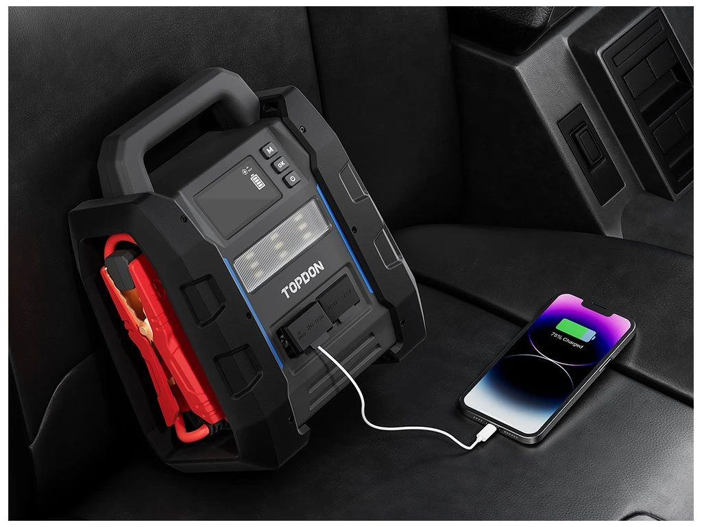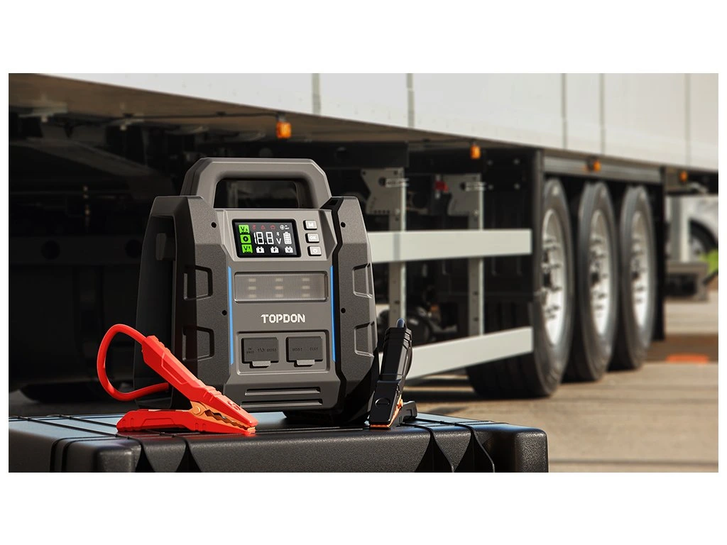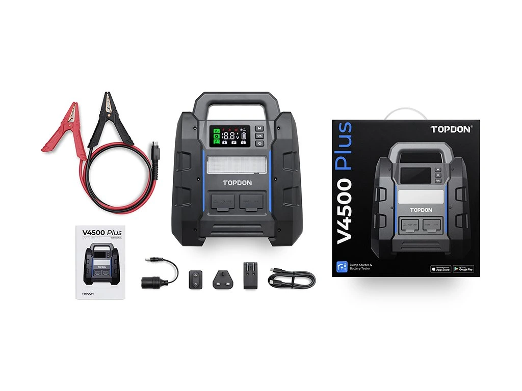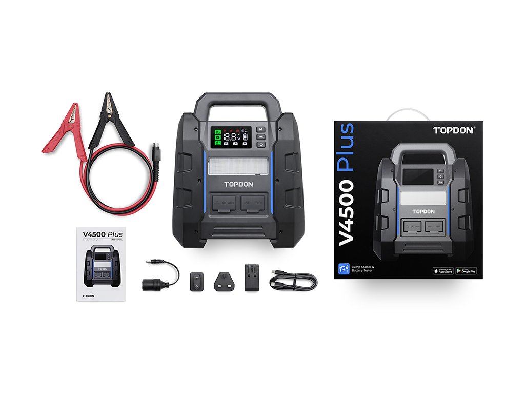 Jump startér TOPDON V4500 Plus nabízí dokonalé řešení napájení pro vozidla s velkým objemem, jako jsou návěsy a přívěsy. Se špičkovým proudem 4500 A je speciálně navržen pro automobily s napětím 12 V a je vhodný pro benzínová a dieselová vozidla s objemem motoru až 16 litrů.