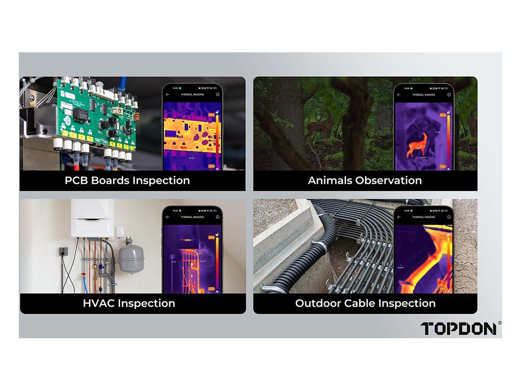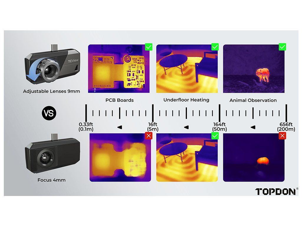 Termokamera TS001 s dlouhým ohniskem pro systém Android byla navržena pro zachycení ostrých snímků i na velmi krátké vzdálenosti, například při inspekci desek plošných spojů. Díky infračervenému snímači s vysokým rozlišením 256 × 192 pixelů a plynulé snímkové frekvenci 25 Hz dokáže precizně zachytit každý detail. Nastavitelný 9mm objektiv umožňuje pokrytí vzdáleností od 0,1 do 500 metrů, což zajišťuje širokou škálu využití, včetně inspekcí budov, pozorování zvířat, oprav automobilů nebo kontroly desek plošných spojů.