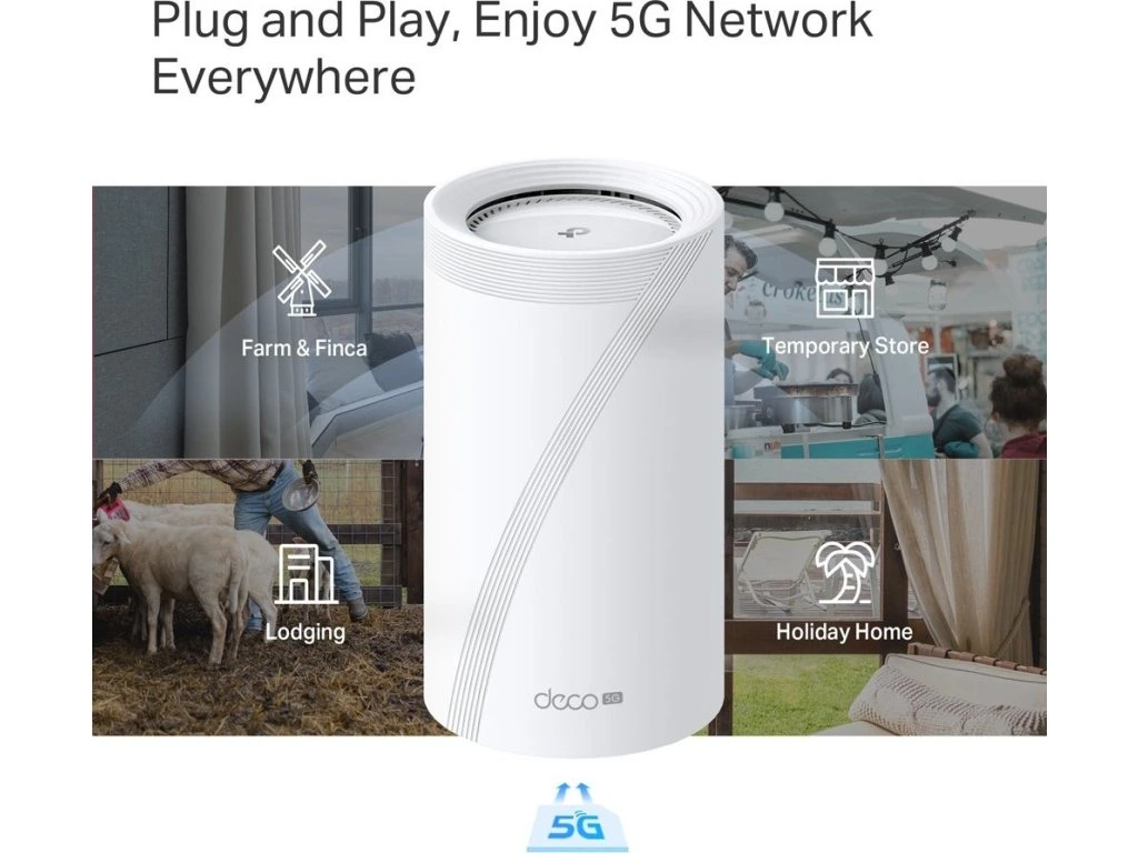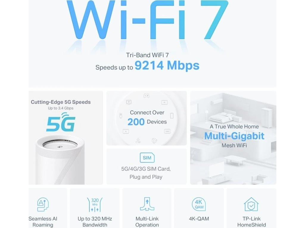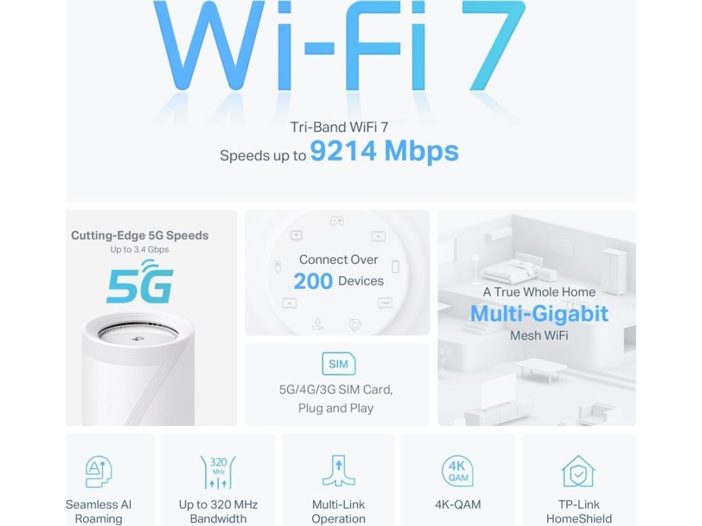 Pokročilý mesh access point s technologií Wi-Fi 7 a integrovaným 5G modemem pro vytvoření rychlé a stabilní domácí sítě.