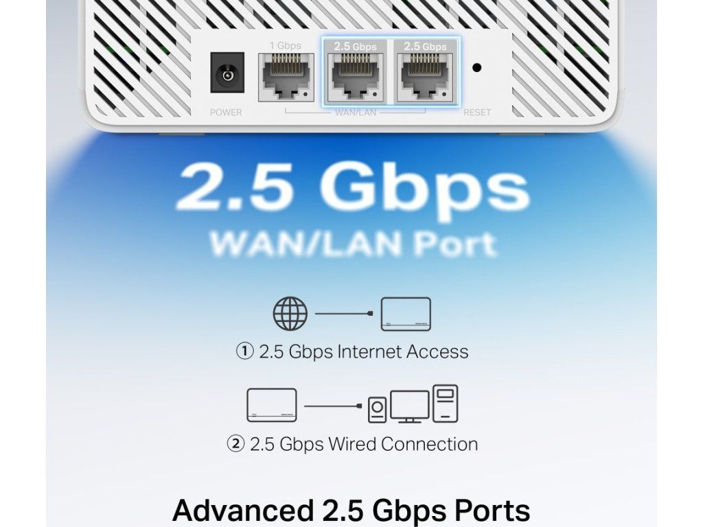 - Pokročilé 2,5G porty (2× 2,5 Gb/s WAN/LAN + 1× 1 Gb/s WAN/LAN) s automatickou detekcí