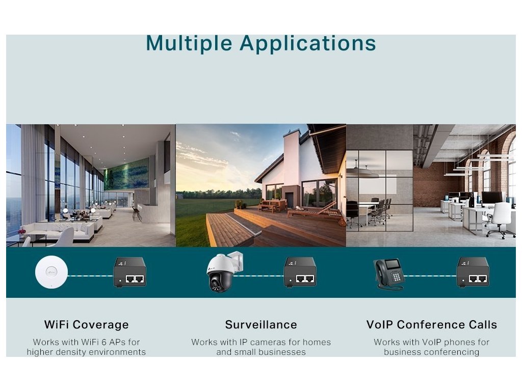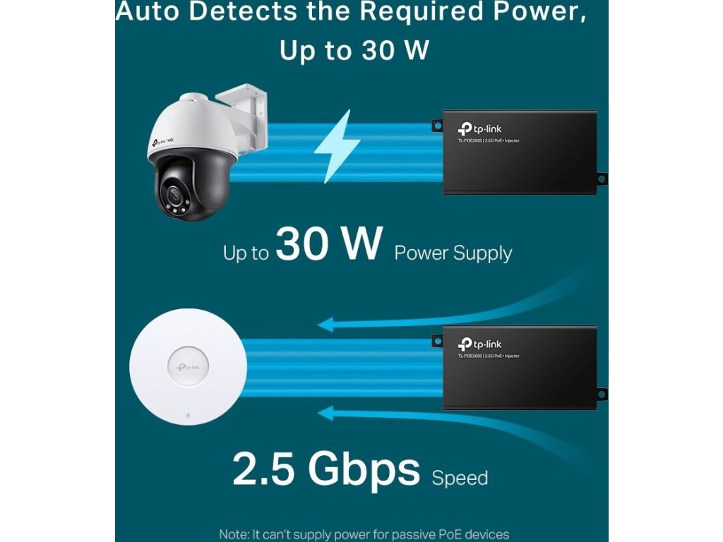 PoE+ injektor TL-POE260S umožňuje rozšířit síť do míst bez přístupu k elektrické zásuvce. Je ideální pro napájení zařízení jako jsou 2,5G přístupové body, HD IP kamery nebo IP telefony.