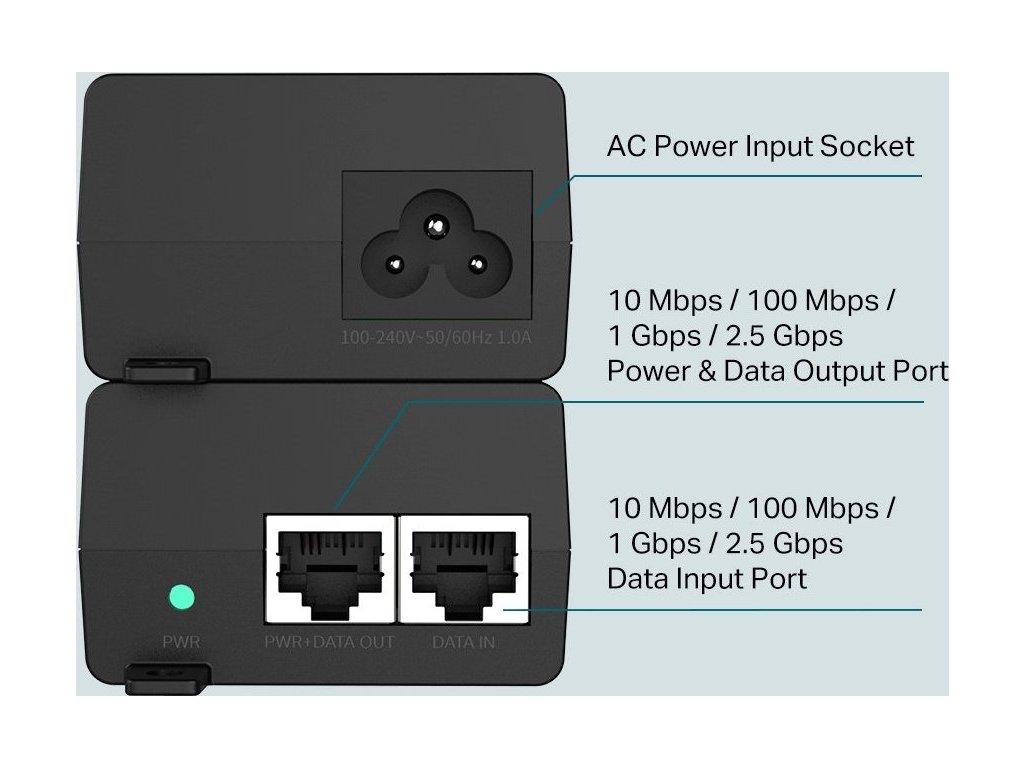 Porty: 1× 10/100/1000/2500 Mbps RJ45 data-in port, 1× 10/100/1000/2500 Mbps RJ45 power+data-out port, 1× AC napájecí konektor