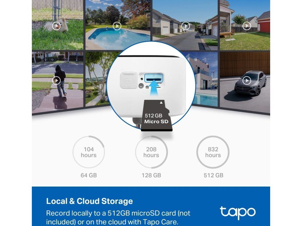 Nahrávání probíhá lokálně na microSD kartu až 512 GB nebo prostřednictvím cloudové služby Tapo Care. Kamera se připojuje přes Wi-Fi 802.11b/g/n na 2,4 GHz s podporou WPA/WPA2-PSK zabezpečení a 128bit AES šifrování.