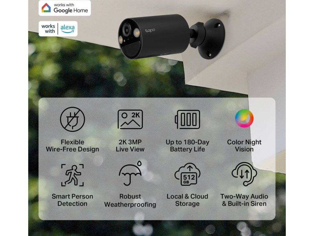 Kamera vyniká barevným nočním viděním s dosahem až 9 metrů díky objektivu s velkou clonou F1.65 a vestavěným LED reflektorům. S výdrží baterie až 180 dní na jedno nabití minimalizuje údržbu a poskytuje nepřetržitou ochranu vašeho majetku.