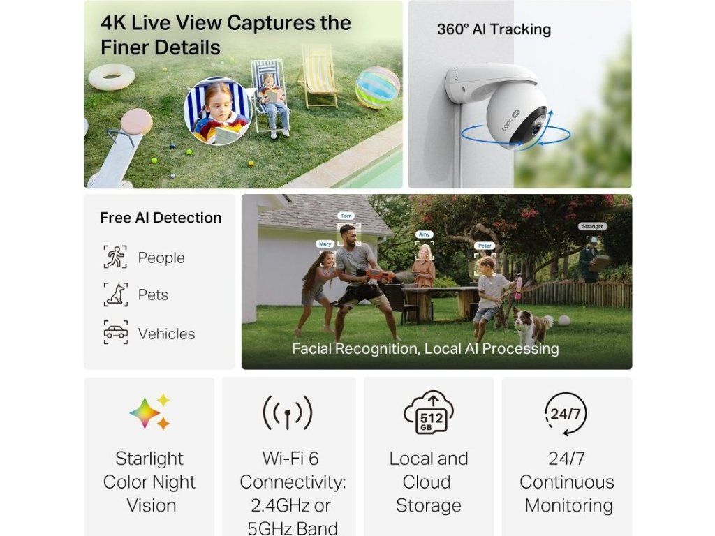 Umělá inteligence rozpoznává osoby, domácí zvířata a vozidla a zasílá upozornění pouze tehdy, když je to skutečně nutné. Kamera poskytuje 360° záběr a přesně sleduje osoby, domácí zvířata a vozidla.