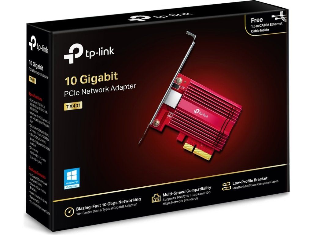 TP-Link TX401 10 Gigabit PCI Express Network Adapter. Upgradujte na síť 10G. 10 Gigabit Ethernet dosahuje neuvěřitelně vysokých datových rychlostí až 10 miliard bitů za sekundu - 10krát rychleji než standardní Gigabit Ethernet. Je to zcela nová éra pro všechny vaše úkoly náročné na šířku pásma, od místních datových přenosů po přístup k internetu.