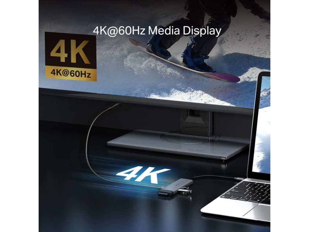 Tato dokovací stanice vám umožní připojit k vašemu zařízení s USB-C portem monitor přes HDMI s rozlišením až 4K při 60 Hz, využít čtečky SD a microSD karet s podporou UHS-I standardu, nabíjet zařízení díky Power Delivery s výkonem až 100 W a připojit až tři USB-A zařízení s přenosovou rychlostí 5 Gbps.