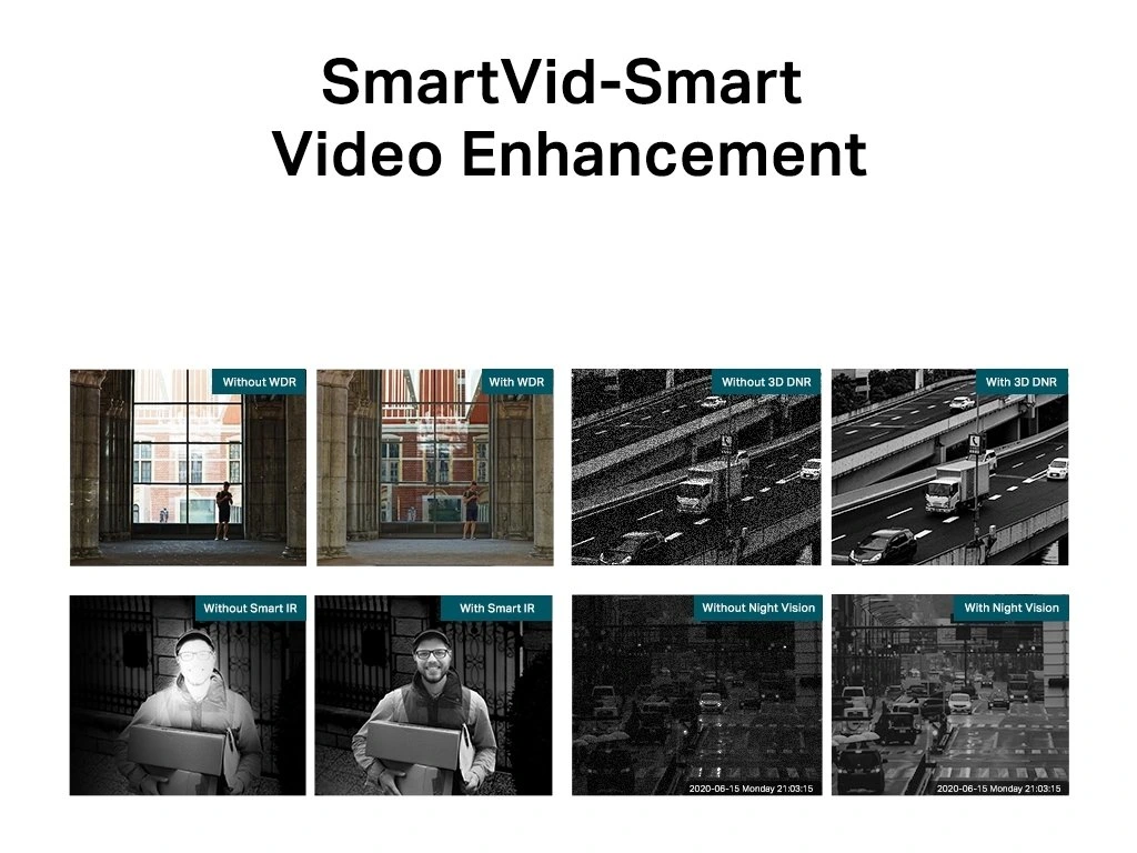 - Inteligentní vylepšení videa: Profesionální technologie společnosti VIGI zpracovávají videa a výrazně zlepšují jejich kvalitu, která je pro vaše sledování zásadní, včetně technologií Smart IR, True WDR, 3D DNR a nočního vidění.