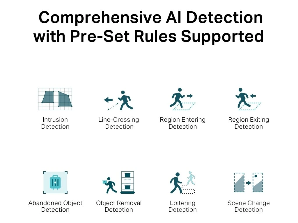 - Chytrá detekce: Přijímejte oznámení a kontrolujte videokanály, když někdo překročí hranici, vstoupí do nastavené oblasti nebo překáží kameře.