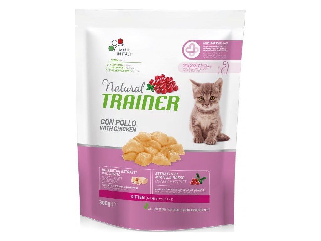 Kompletní vyvážené krmivo pro kočky, které bylo sestaveno tak, aby nutričně vyhovělo všem fázím růstu kočky. Je vhodné pro koťata od 1 do 6 měsíců věku. Obsahuje přírodní ingredience, včetně kuřecího masa, pivovarských kvasnic a brusinek, které mají blahodárný vliv na močový systém kočky. Tyto granule jsou velmi chutné a lze je kombinovat i s mokrými krmivy Natural Trainer.