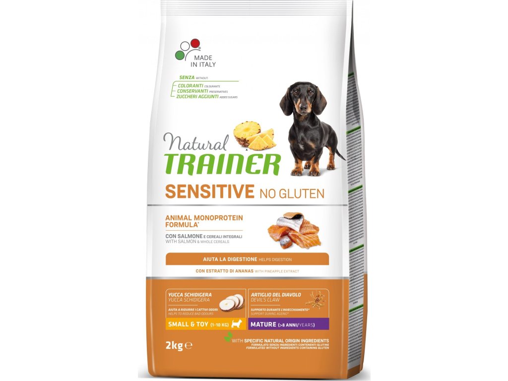 Krmivo Trainer Natural Sensitive No gluten Maturity Mini losos je speciálně navržené pro citlivé zažívání psů malých plemen (1-10 kg). Neobsahuje lepek, zato v něm pro lepší stravitelnost najdete pouze jeden druh živočišných proteinů. Díky lahodné chuti lososa si jej zamilují i nejmlsnější malé jazýčky. S ananasovým extraktem a s jukou pro redukci zápachu. Bez barviv, konzervantů a přidaných cukrů.