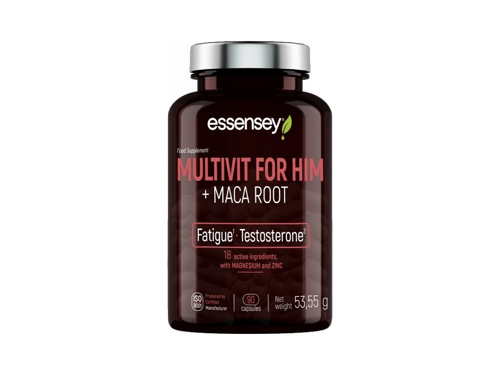Multivit for Him + Maca Root značky Essensey (Trec Nutrition) obsahuje 18 aktivních látek speciálně sestavených pro potřeby mužů - vitamíny, L-arginin, extrakt z maca, kyselina D-asparagová (DAA), taurin, hořčík a zinek. Hořčík přispívá ke snížení únavy a vyčerpání, zinek přispívá k udržení normální hladiny testosteronu v krvi.