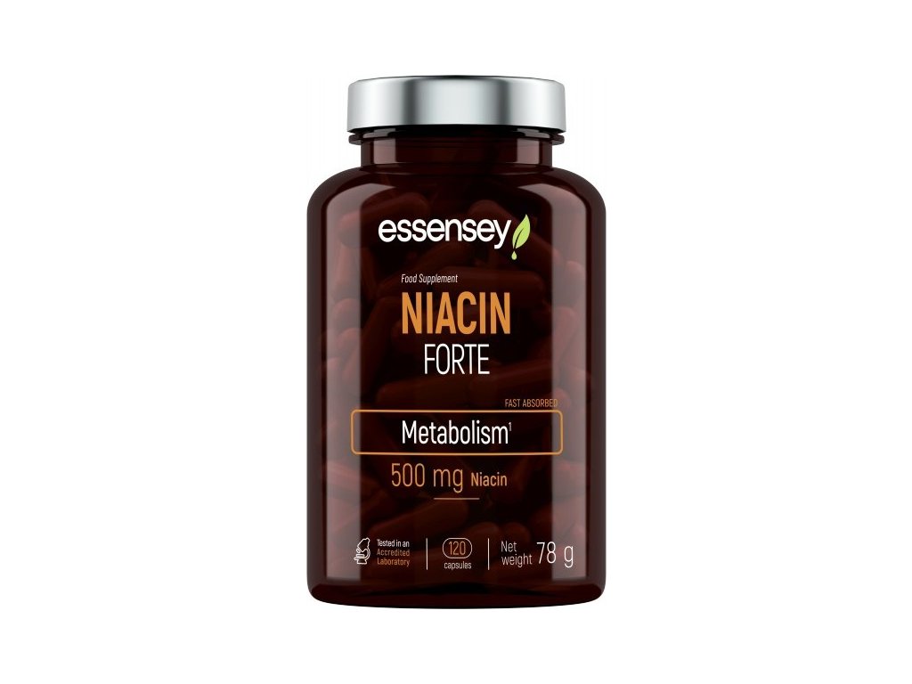 Niacin Forte značky Essensey (Trec Nutrition) nabízí v jedné dávce 500 mg vitamínu B3, který přispívá k normálnímu energetickému metabolismu, správnému fungování nervového systému, funkci psychiky, k udržení zdravé pokožky, ke snížení vyčerpání a únavy.