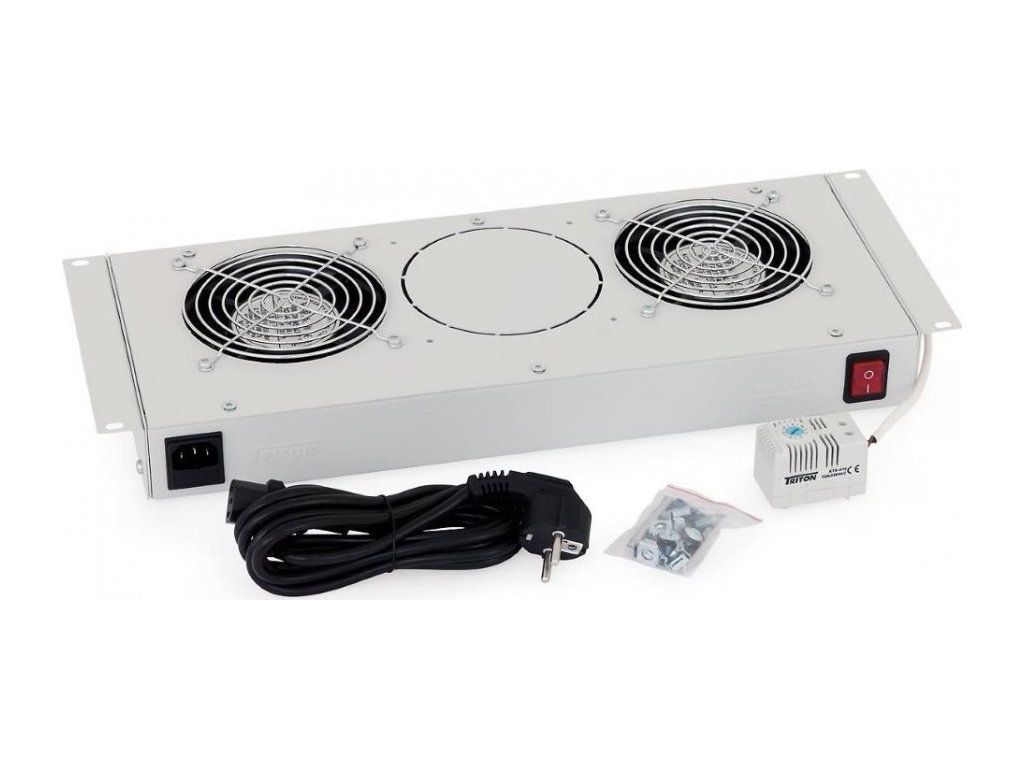 Triton ventilační jednotka 19"Ventilační jednotka s jedním ventilátorem a termostatem určená pro 19" stojanové rozvaděče. Montuje se podle potřeby do podlahy nebo stropu rozvaděčů - do stropu se instaluje z venkovní strany rozvaděče, do základny pak z vnitřní strany rozvaděče. Při instalaci do základny rozvaděče je nutno použít montážní rám spodní ventilační jednotky – RAx-CH-XXX-X1, který se instaluje pomocí oboustranné lepící pásky.