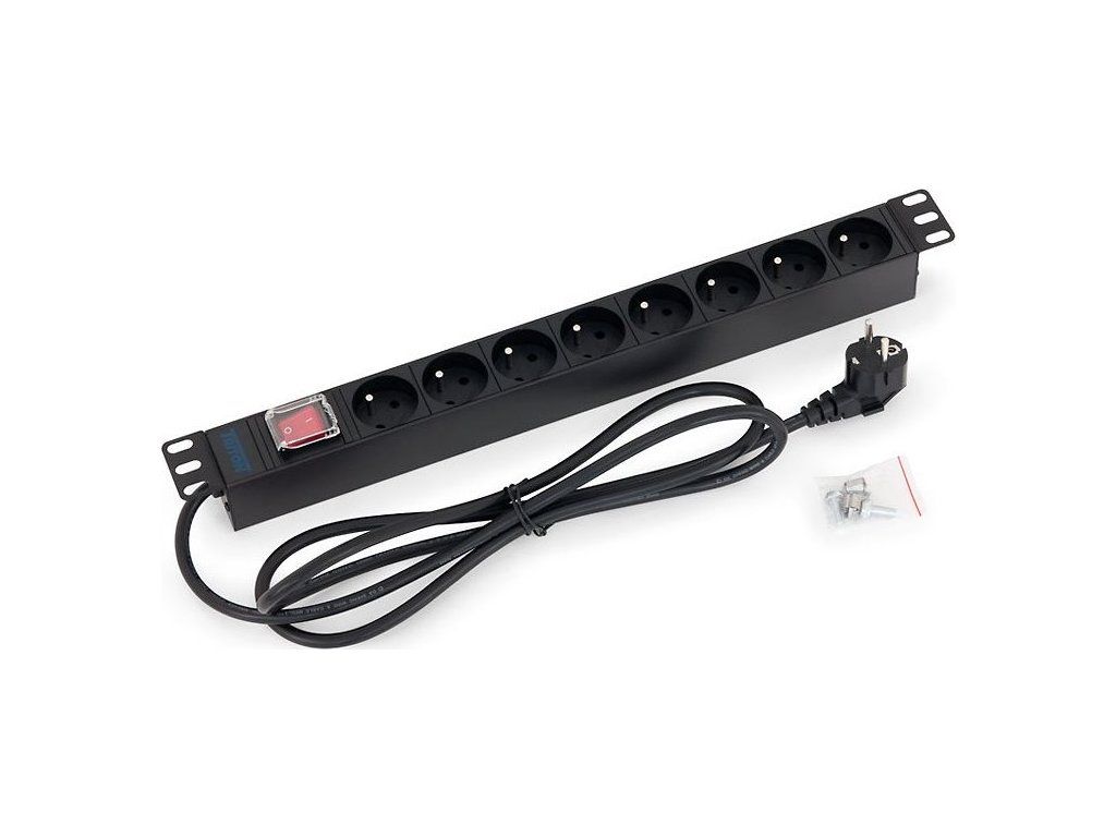 19" rozvodný panel 1U, 8x zásuvka podle ČSN, max 16A, kabel 3x1,5mm, 2m + zástrčka univezál CZ-DE max. 16A, podsvícený vypínač, RAL 9005;