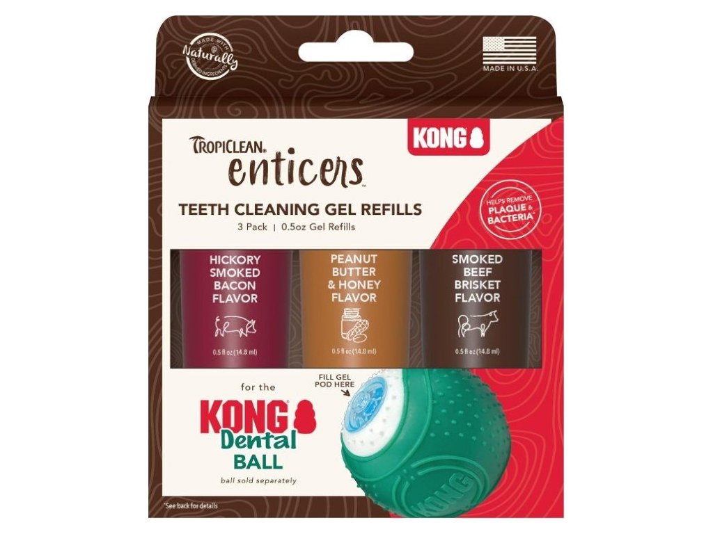 TropiClean Enticers Teeth Cleaning Gel Refill Pack pro KONG Dental Ball obsahuje tři lahodné příchutě, které můžete vyzkoušet se svým KONG Dental Ball.