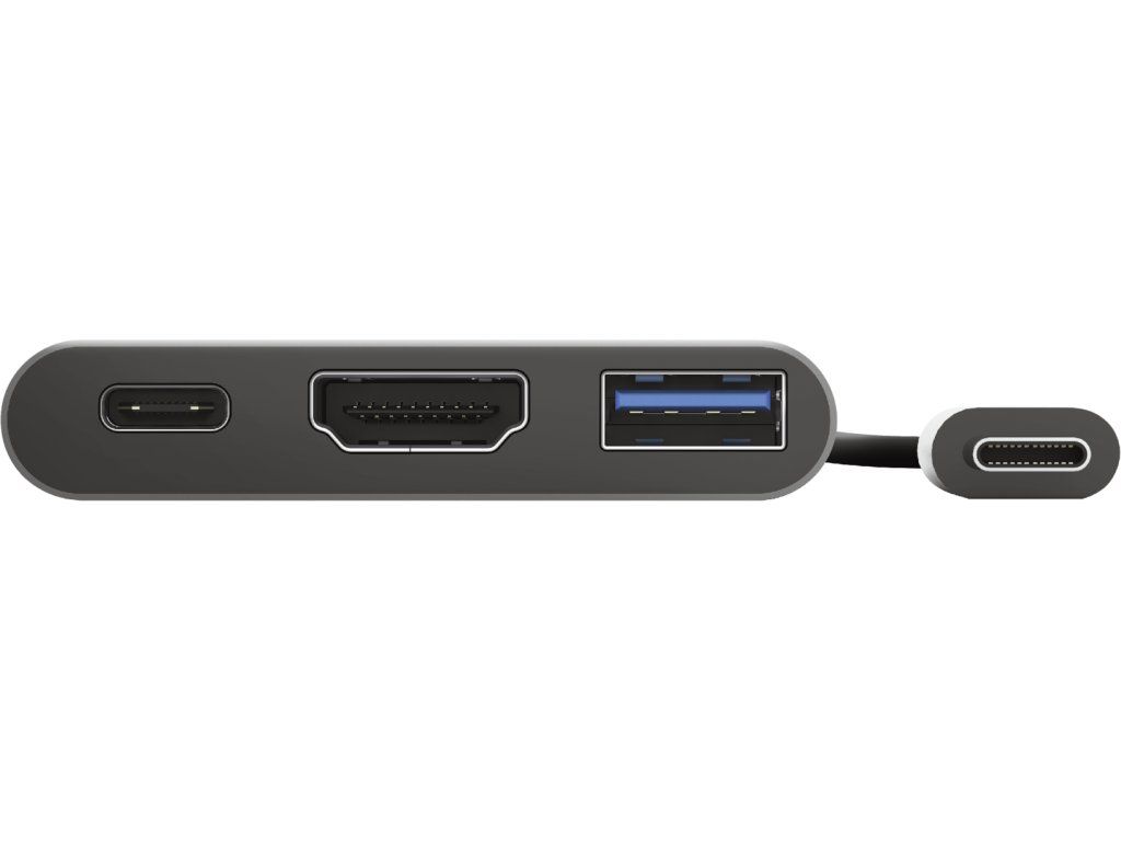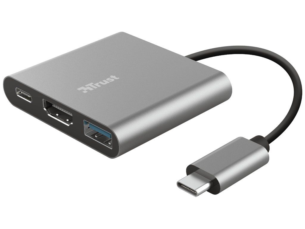 TRUST Dalyx 3-in-1 Multiport USB-C Adapter. Stylový hliníkový 3portový adaptér USB-C z hliníku pro přidání portů USB a HDMI a nabíjecího portu typu C do notebooku.