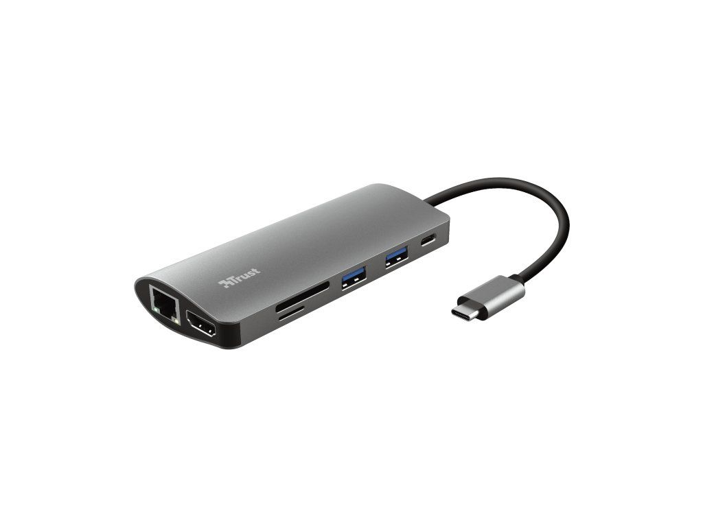 Trust Dalyx 7-in-1 USB-C Multiport Adapter. Stylový hliníkový víceportový adaptér pro přidání portů HDMI, sítě, čtečky karet, USB-C a USB do vašeho notebooku pomocí jediného připojení USB-C. Tenké notebooky jsou skvělé, ale jejich nedostatek portů pro připojení může být problém. S adaptérem Trust Dalyx 7 v 1 se vaše produktivita zvýší sedmkrát díky přiloženému připojení HDMI, Ethernet, paměťové karty, USB a USB-C.