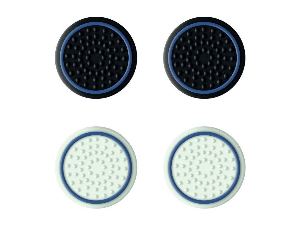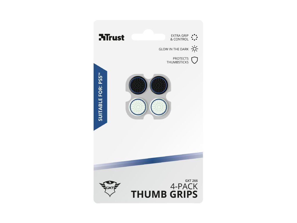 Trust GXT 266 4-pack Thumb Grips pro PS5. Sada 4 palcových gripů pro váš ovladač PlayStation 5 pro extra úchop a kontrolu. Máte novou konzoli PlayStation 5? Vítejte v hraní nové generace! Aby se vám váš nový ovladač DualSense dobře uchopil, jsou zde tyto Trust Thumb Grips. Tato sada má celkem 4 návleky z nichž dva svítí ve tmě, což vám pomůže udržet palce na analogových páčkách i v noci.