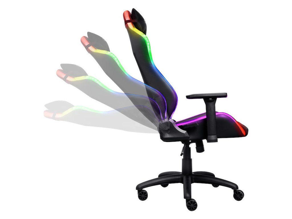 Herní židle s RGB podsvícením, plně nastavitelné. Více než 350 barev a efektů, dálkový ovladač, powerbanka. 3D područky, sklopné sedadlo s aretací, možnost změny výšky, náklon opěradla - 90 až 180 stupňů. Tvarovaná pěna vysoké hustoty, prodyšná tkanina, odolná tkanina na bocích. Nosnost 150 kg, bederní a krční polštář. Powerbanka není součástí balení.