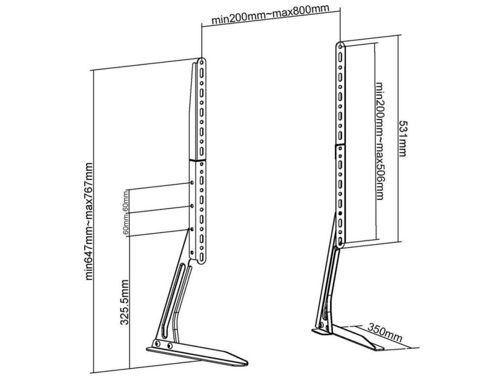 Rozměry VESA: 75 × 75 / 100 × 100 / 100 × 200 / 150 × 150 / 200 × 100 / 200 × 200 / 300 × 200 / 300 × 300 / 400 × 200 / 400 × 300 / 400 × 400 / 600 × 400 / 800 × 400 mm