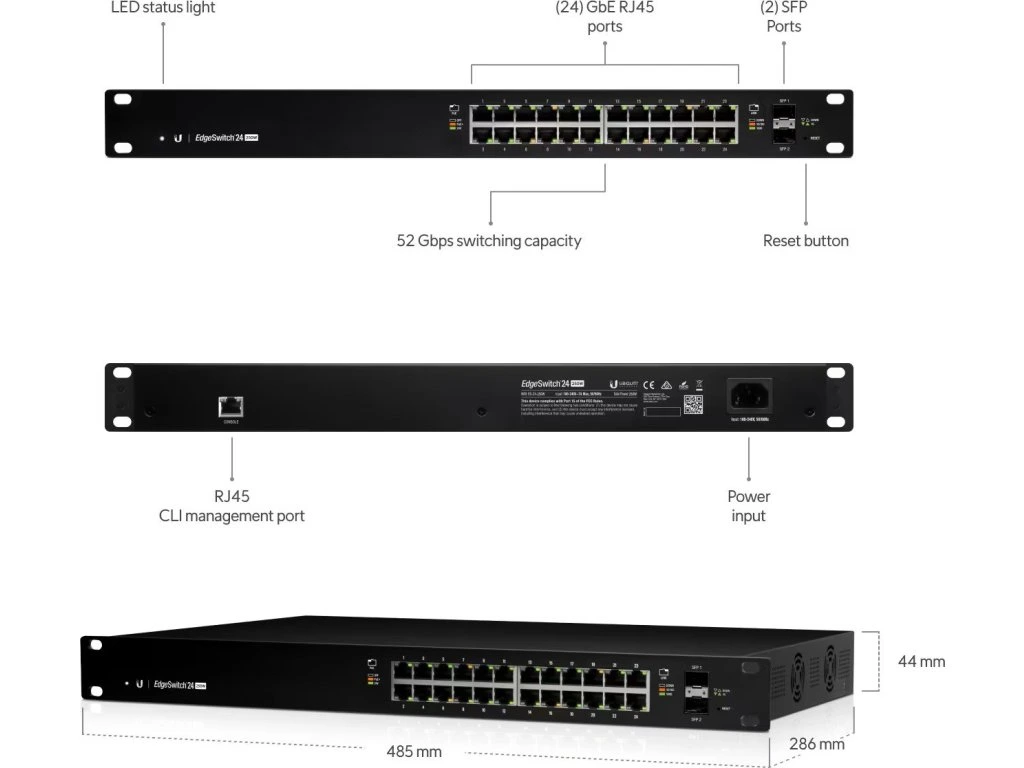 EdgeSwitch ES-24-250W je vysoce výkonný, plně gigabitový L2+L3 switch známého výrobce Ubiquiti z platformy EdgeMAX. Je osazen 24 Gbit ethernetovými porty a dvěma Gbit SFP porty. Switch má vysokou propustnost až 26 Gbps.
