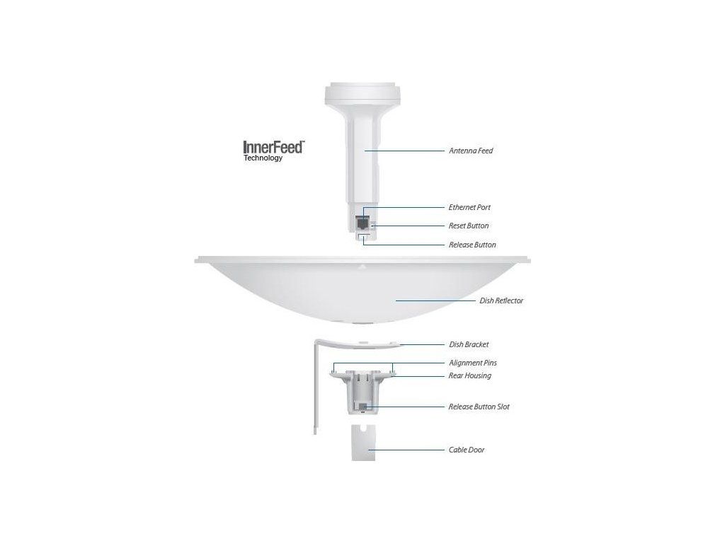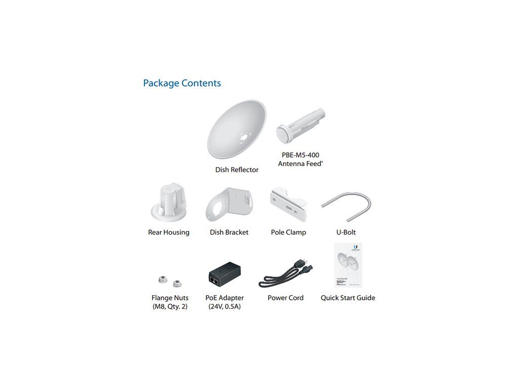 Uvnitř PowerBeamu se nachází výkonný MIPS procesor Atheros 74KC s frekvencí 560MHz, kterému sekunduje 64MB operační paměti typu DDR2 a 8MB Flash paměť. Síťový port podporuje 10/100/1000 Ethernet a lze jej napájet přes pasivní 24V/0,5A Gigabit PoE, které je součástí balení. Aktivní PoE dle standardu 802.3af není podporováno!
