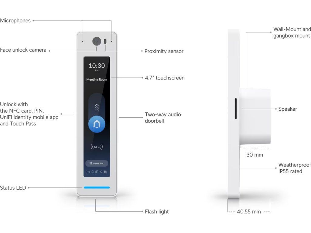 Dveře jednoduše odemknete pomocí obličeje, karty NFC, kódu PIN, mobilní aplikace UniFi Identity či Touch Pass.