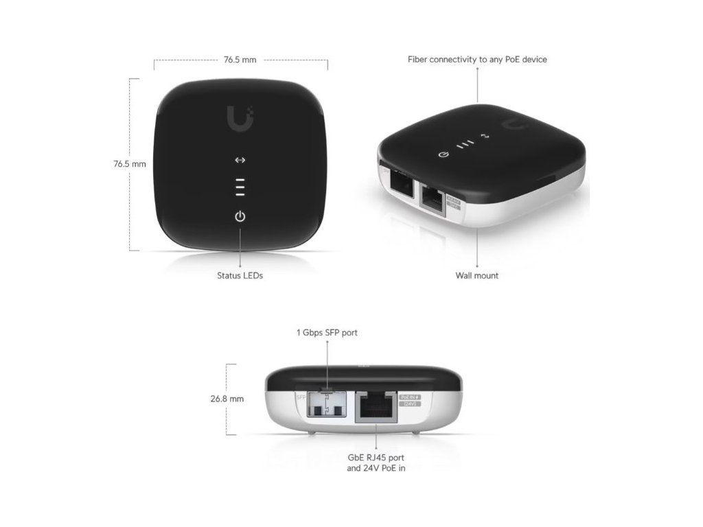 Mediální modul z optických vláken na měď, který umožňuje bezdrátovým zařízením bez SFP portů podporovat optické uplinky až do rychlosti 1 Gb/s.