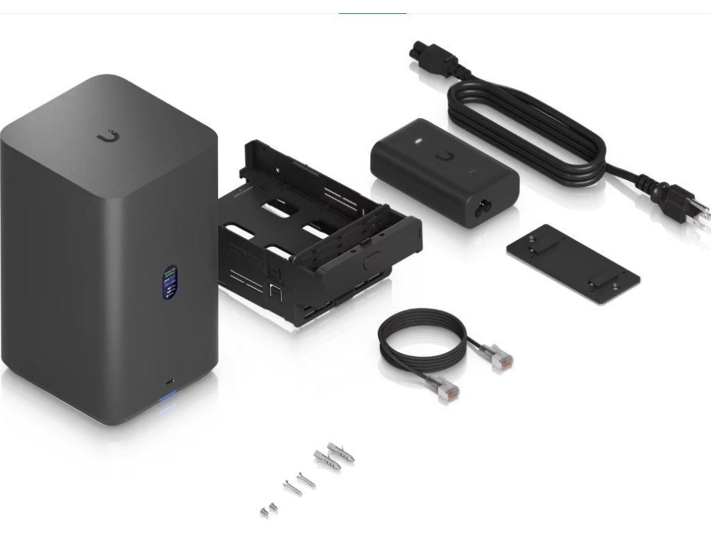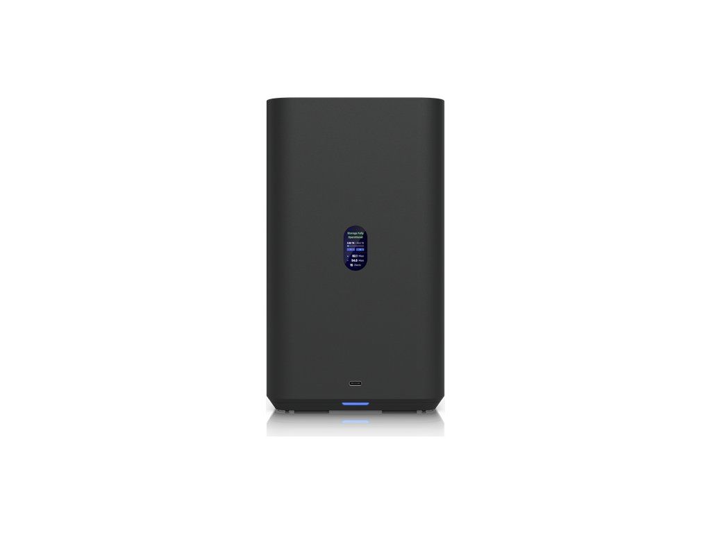 * Zařízení disponuje barevným 1.47" LCM displejem pro rychlé informace o stavu a podporuje správu přes UniFi Drive aplikaci.