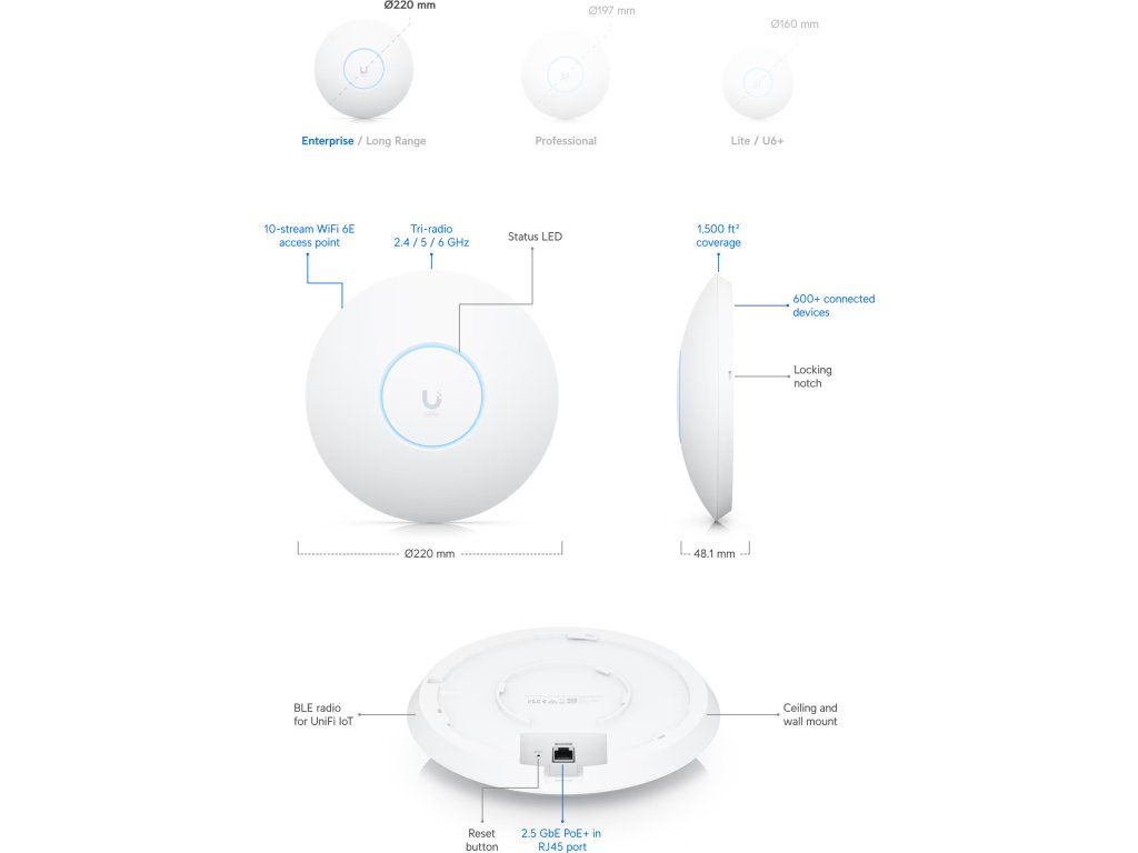 Ubiquiti UniFi 6 EnterpriseJednotka UniFi 6 Enterprise (U6-Enterprise) je výkonný 3pásmový Wi-Fi 6E access point s podporou frekvenčních pásem 2,4/5/6 GHz a přenosovou rychlostí až 10,2 Gbps (agregovaná propustnost). Díky relativně malým rozměrům a bezproblémovým pokrytím v prostředí s vysokou hustotou klientů je ideální pro firemní a komerční použití.