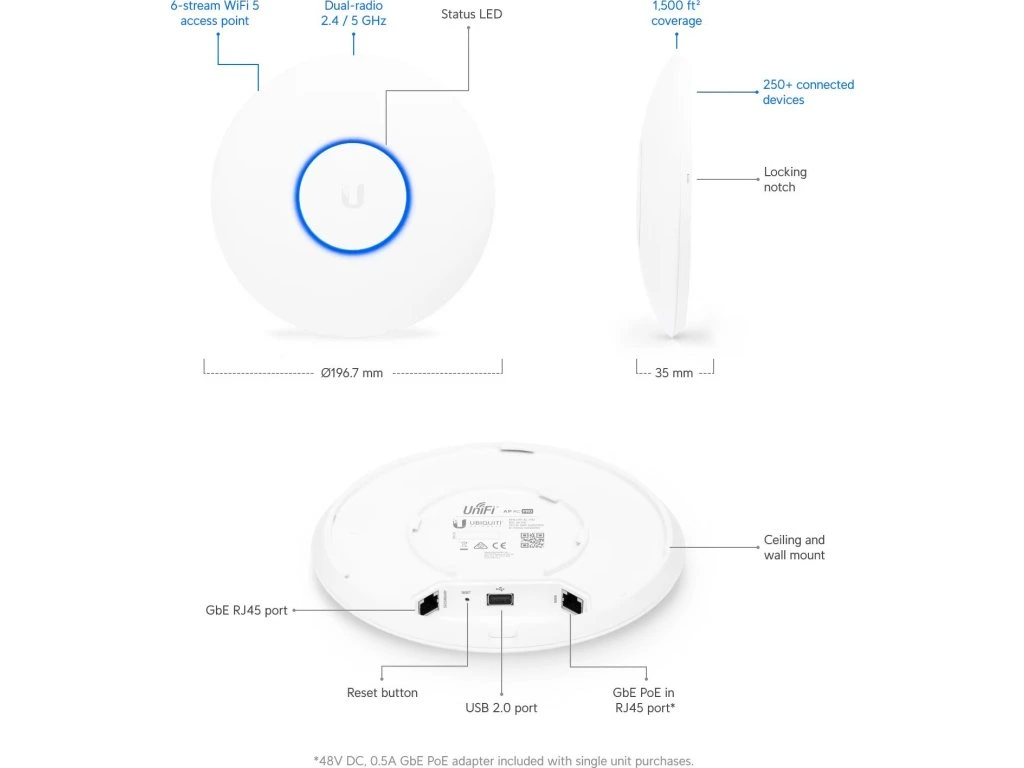 Jednotka UniFi AC-PRO (AP-AC-PRO) je revoluční jednotkou od Ubiquiti. Podporuje přenosovou rychlost až 1750 Mbps a frekvence 2,4 i 5 GHz! Navíc se jedná o verzi s podporou nejnovější normy 802.11ac a PoE napájení 802.3af/802.3at.