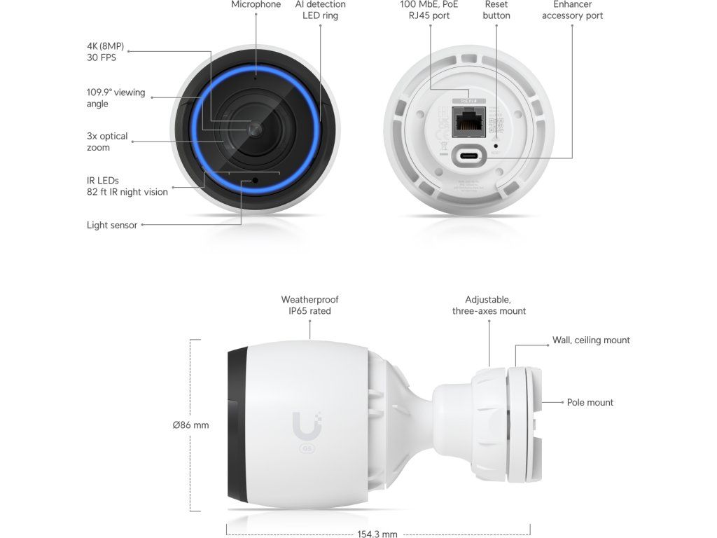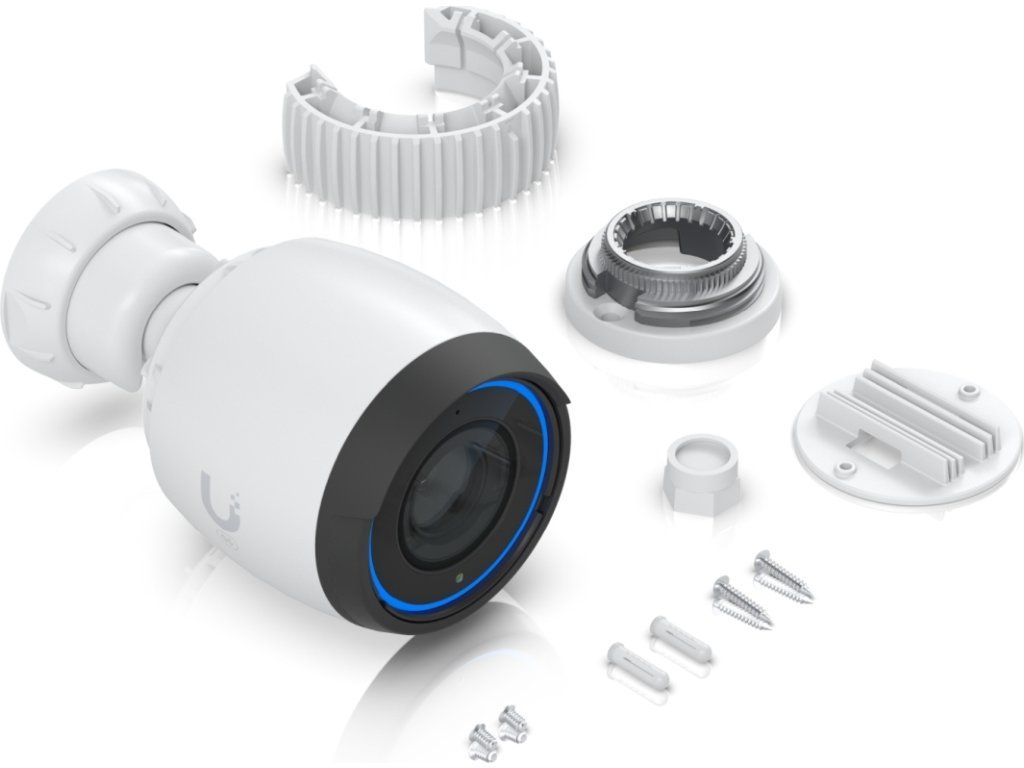 Kamera UniFi Protect G5 Professional poskytuje čistý a ostrý obraz ve 4K rozlišení 3840 × 2160 při 30 fps s možností nočního vidění (dosah 15–25 m).