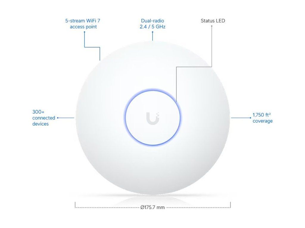 Kompaktní stropní Wi-Fi 7 AP s pěti prostorovými streamy, podporou frekvenčních pásem 2,4 GHz a 5 GHz a přenosovou rychlostí až 4,3 Gbps v pásmu 5 GHz a 688 Mbps v pásmu 2,4 GHz. Podporuje PoE napájení. Model U7 Long-Range je určen pro dlouhé trasy a umožňuje montáž na zeď či strop.