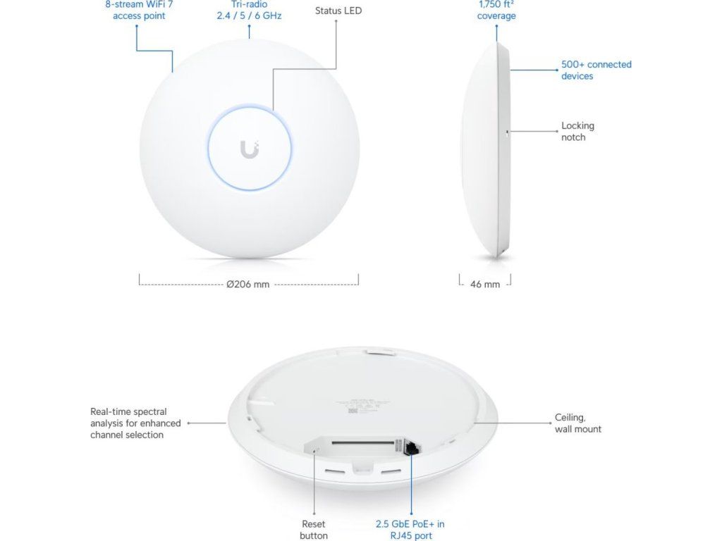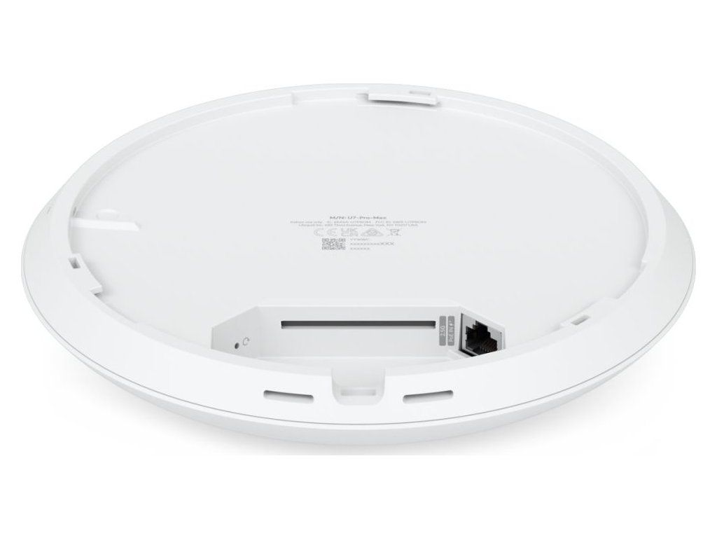 UniFi U7 Pro Max je designově povedené vnitřní hotspotové řešení využívající standard 802.11a/b/g/n/ac/ax/be. Je vybaveno anténním systémem MIMO 2×2 (2,4 GHz), MIMO 4×4 (5 GHz) a MIMO 2×2 (6 GHz) v podobě integrovaných antén se ziskem 4 dBi/ 6 dBi/ 5,9 dBi (2,4 GHz/ 5 GHz/ 6 GHz).