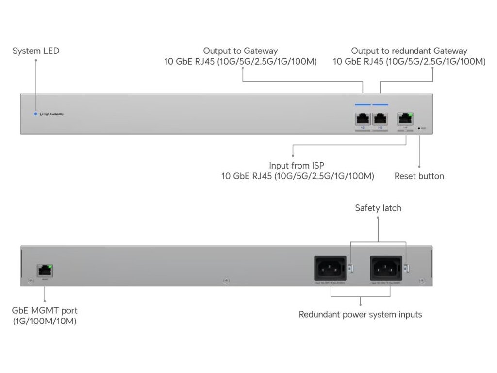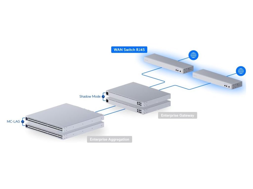 10GbE WAN switch propojující dvě UniFi brány s vysokou dostupností ve stínovém režimu s jedním poskytovatelem internetu.